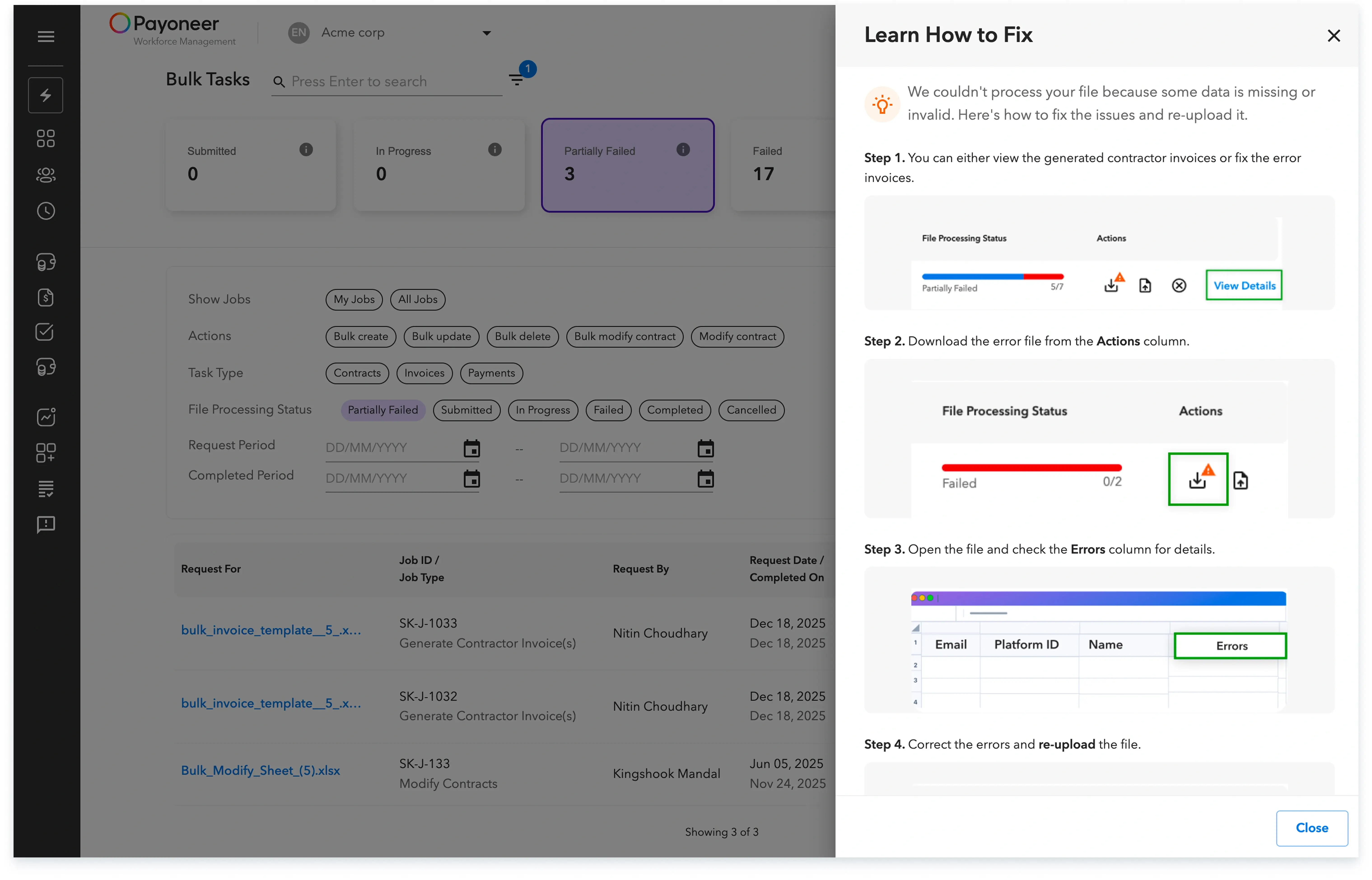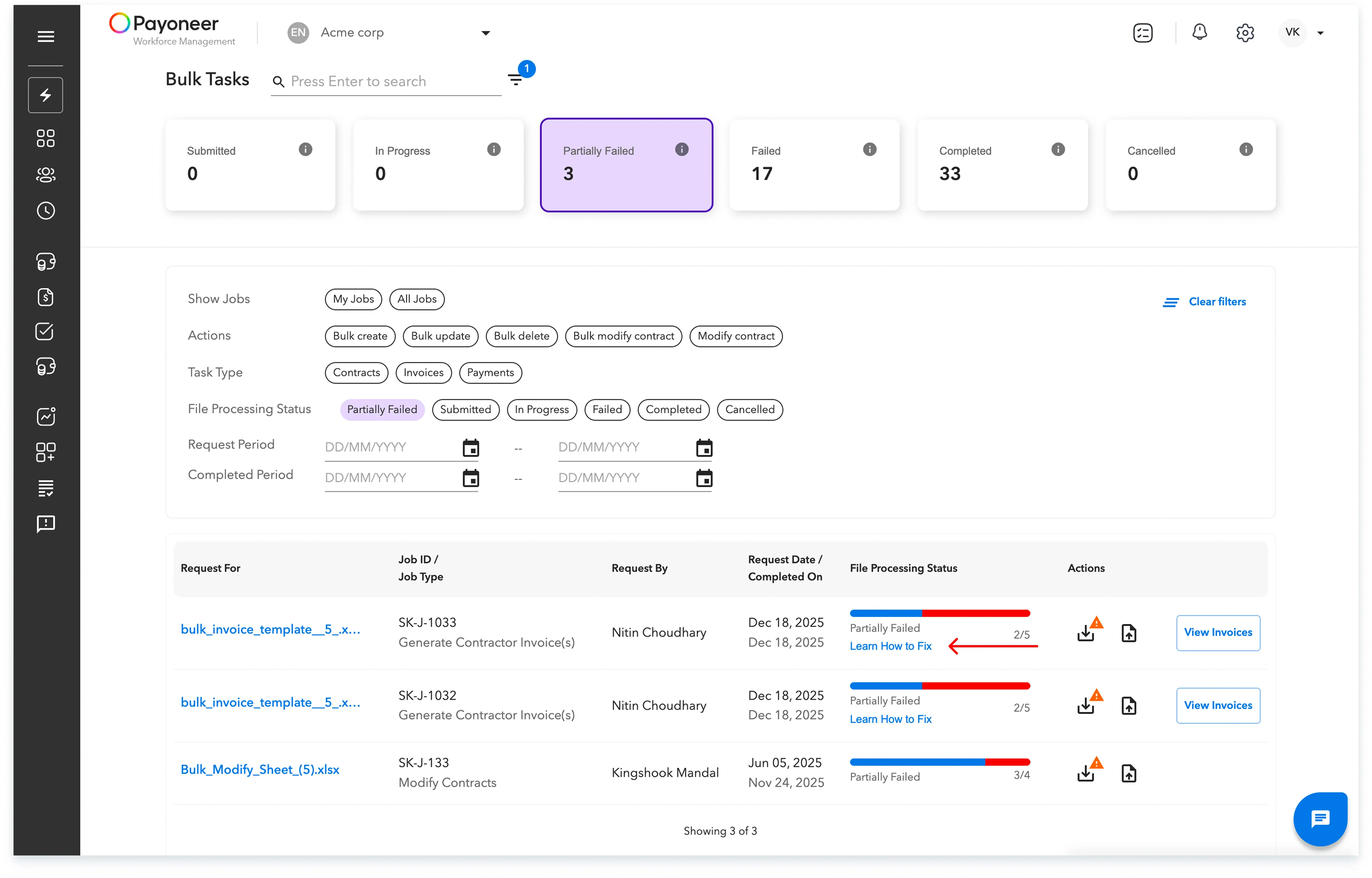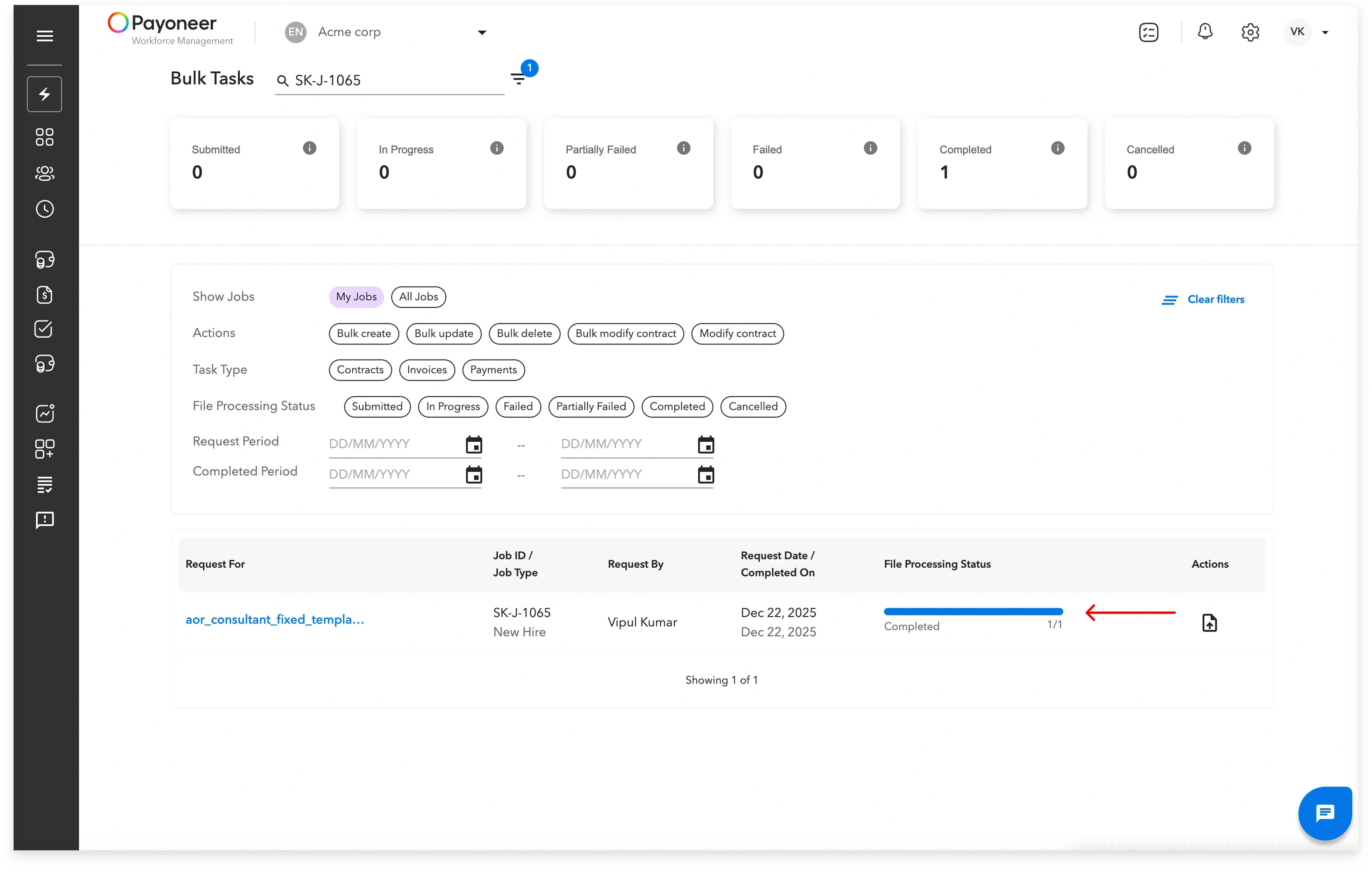 On the progress page, you can view details like the template uploaded, the request date, and the file processing status, which will be updated as Submitted, In Progress, Partially Failed, Failed, Completed, or Cancelled.