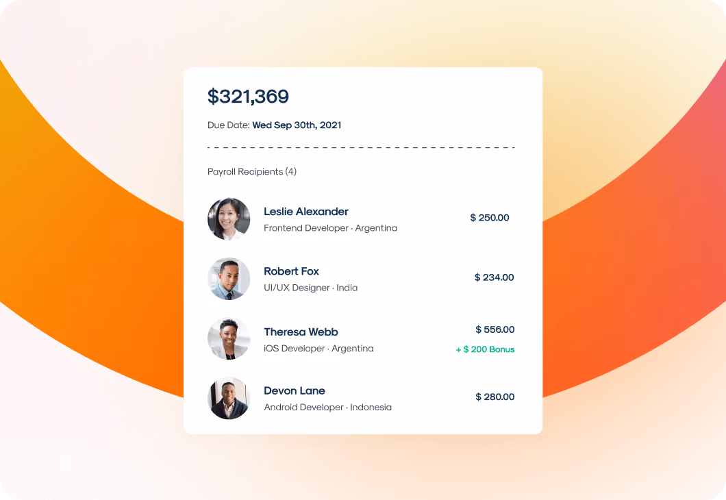 Run payroll in 70 currencies, with support to handle taxes, benefits, and statutory payments.